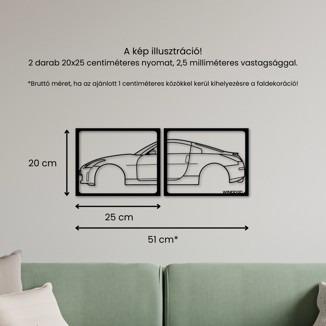 A sziluett két különálló elemből áll, amelyek együtt térhatású, vizuálisan kiegyensúlyozott kompozíciót alkotnak. Ideális választás, ha szeretnél egy látványos, mégis visszafogott autós faldekorációt.