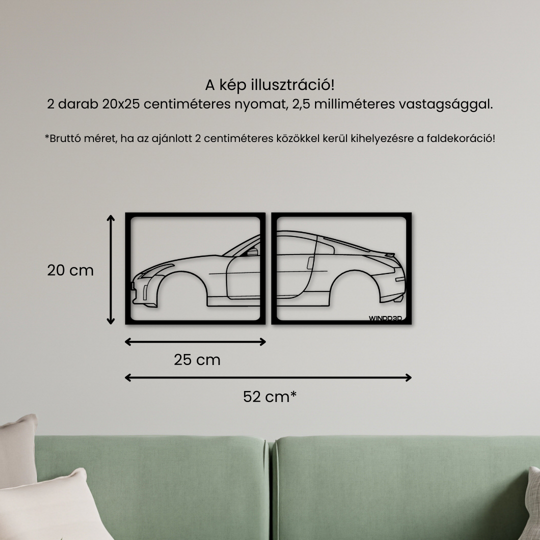 A sziluett két különálló elemből áll, amelyek együtt térhatású, vizuálisan kiegyensúlyozott kompozíciót alkotnak. Ideális választás, ha szeretnél egy látványos, mégis visszafogott autós faldekorációt.